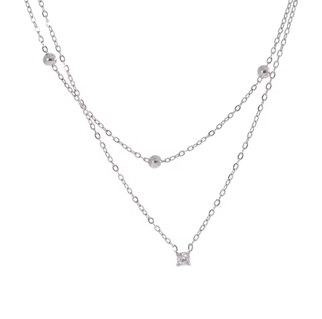 A layered silver design that blends simplicity and soft radiance. A cubic zirconia pendant anchors the lower chain, while three polished charms float above—perfect for delicate, everyday luxury.