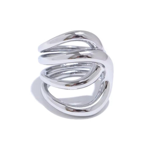 A sculptural, multi-layered design available in both gold and silver. Four open bands align with subtle spacing, creating a dimensional, contemporary look that balances structure with softness.