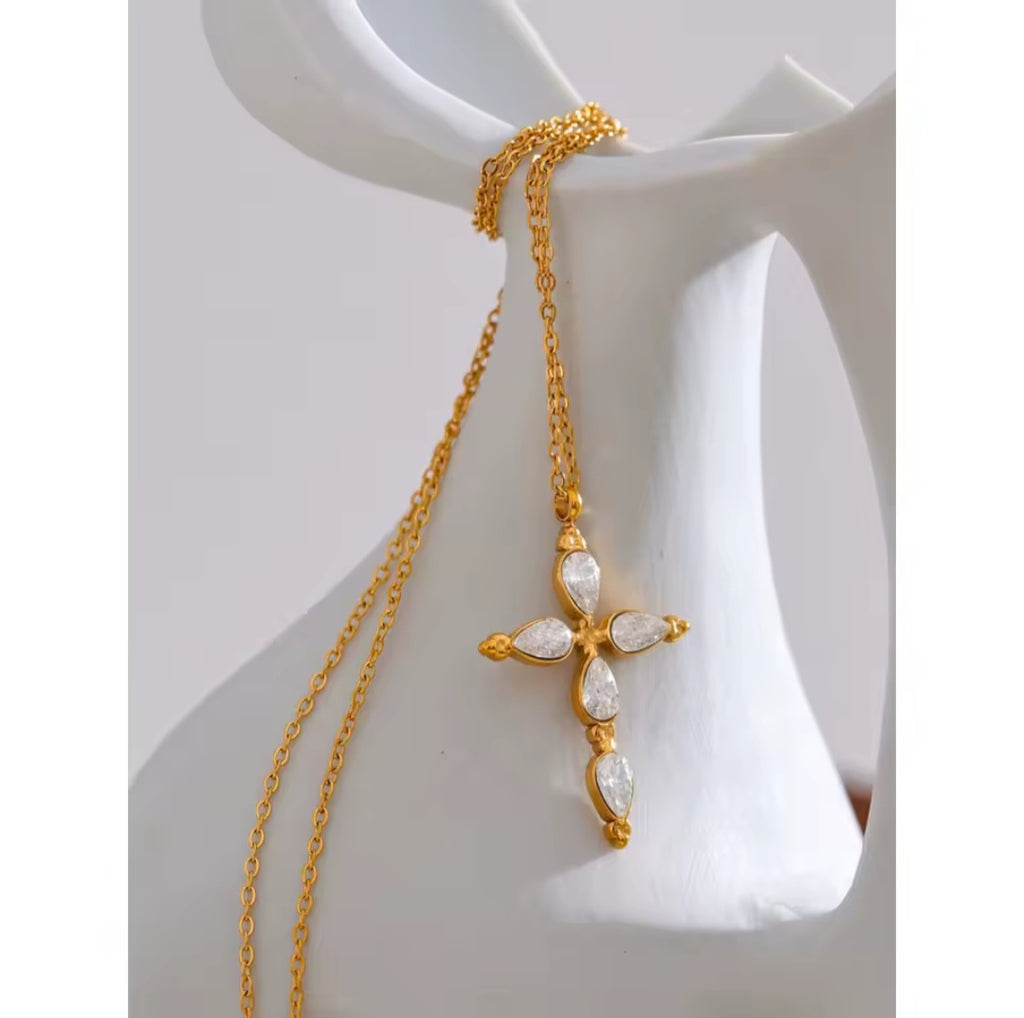 A timeless gold cross illuminated by five clear cubic zirconia stones. Clean lines and quiet shine make this a refined essential for every jewelry lover.